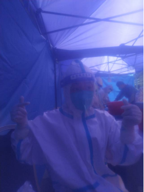 2018级基础医学专业朱明婷同学写道:“来这里才两天,当我穿上防护服后,每一分钟都能感受到汗水沿着脖子流下,偶尔面屏会起雾,运动过快突然就呼吸不自由了,切身感受到疫情期间防疫人员的艰辛,脱下防护服的时候,汗水都把衣服湿透了,而和我们一起的好几个工作人员,在我们换班的时候,他们还在忙,每次同学需要帮助的时候,他们都会温和友好的指导,他们像我们的精神支柱,让我在这炎热的空间里不感到烦闷,在这充满危险的环境中特别踏实”。