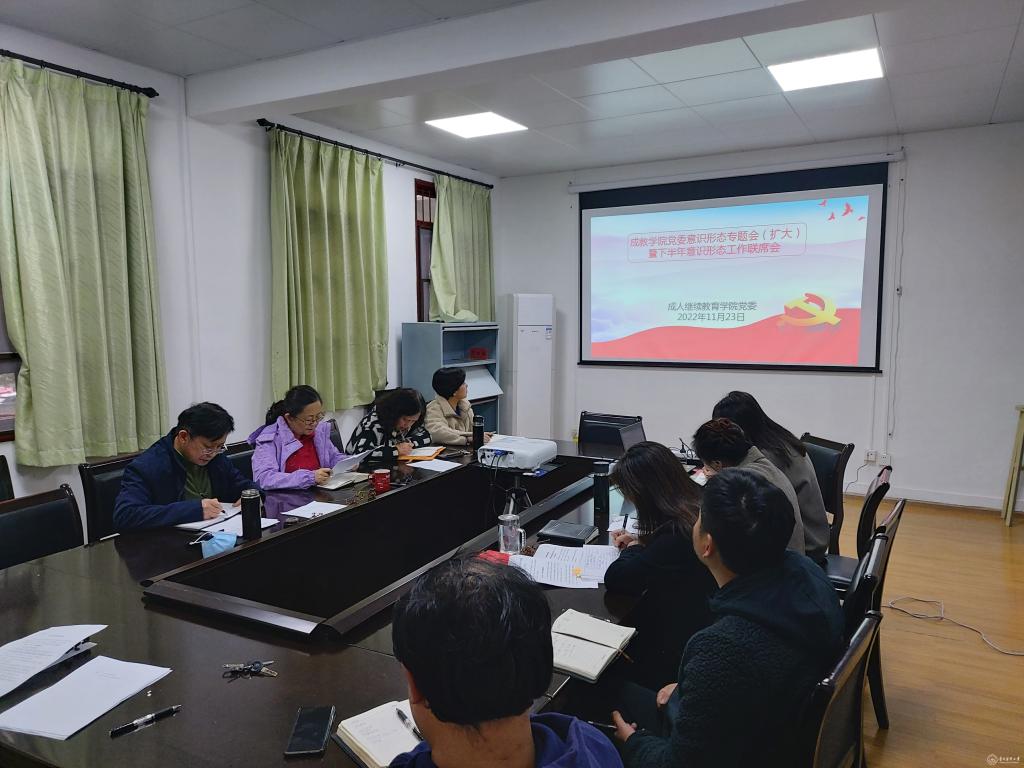 11月23日,成人继续教育学院党委召开意识形态专题会(扩大)暨2022年下半年意识形态工作联席会,学院全体管理干部参加,会议由院党委书记杨国强主持。