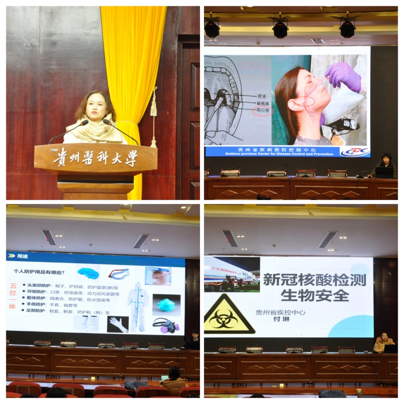 12月4日,公共卫生与健康学院邀请贵州省疾病预防控制中心(CDC)实验中心副主任廖春、病毒科蒋维佳、万永虎、付琳老师为卫生检验与检疫专业本科生和部分研究生开展有关新冠区域核酸采样与检测流程、个人防护、生物安全等相关知识的培训,学院学生管理科副科长原琦、辅导员、班主任参加培训。