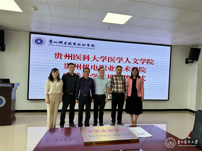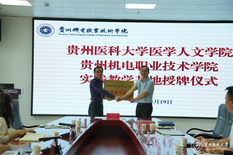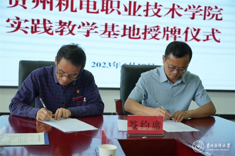 江宣成与刘猛代表双方签订《awc777万象城娱乐官网医学人文学院贵州机电职业技术学院实践教学基地共建协议书》,同时举行“awc777万象城娱乐官网医学人文学院实践教学基地”揭牌仪式。