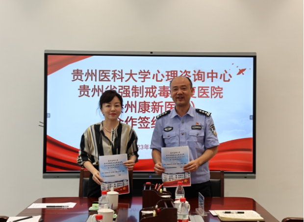 彭丹和贵州省强制戒毒康复医院党委委员、副院长李坤峻签订教学实习基地共建协议,同时进行了“心理健康教育实践基地”揭牌。