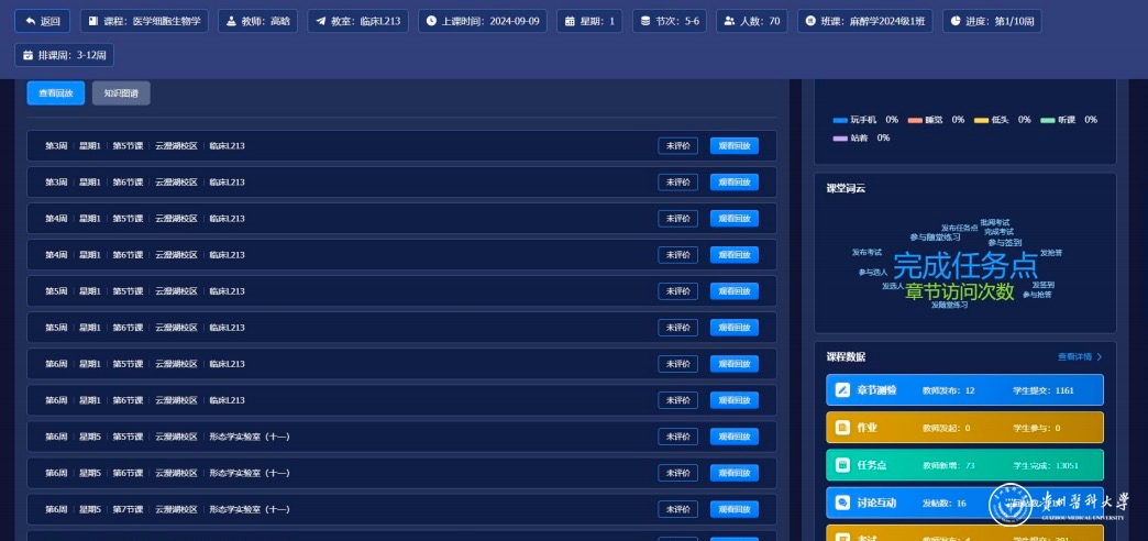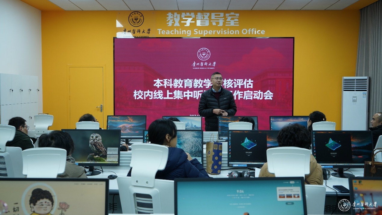 近日,万象城官网在云漫湖校区教学督导室举行本科教育教学审核评估线上集中听评课启动会。教务处处长汪志勇、教务处副处长修江帆、教学督导委员会委员、优秀青年教师骨干、教学质量监控与评估办公室、现代教育技术中心等30余名人员,通过“贵医云”智慧教学督导平台开展线上集中听评课。