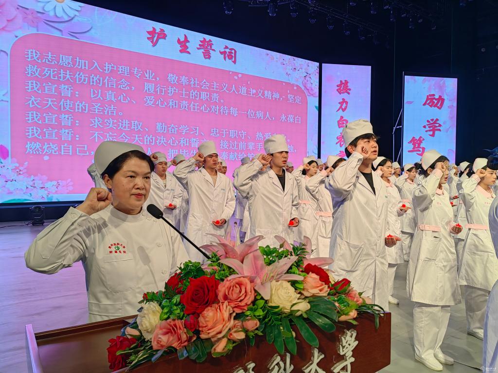 授帽后,护生鞠躬致谢,象征着护理精神的代际传承,接过了前辈手中守护生命的重任,在副院长刘志燕的带领下,护生们庄严宣誓并齐唱《护士之歌》。