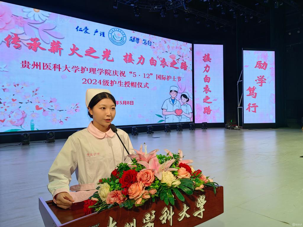随后,护理学2024级学生尹娜娜代表全体授帽护生发言。