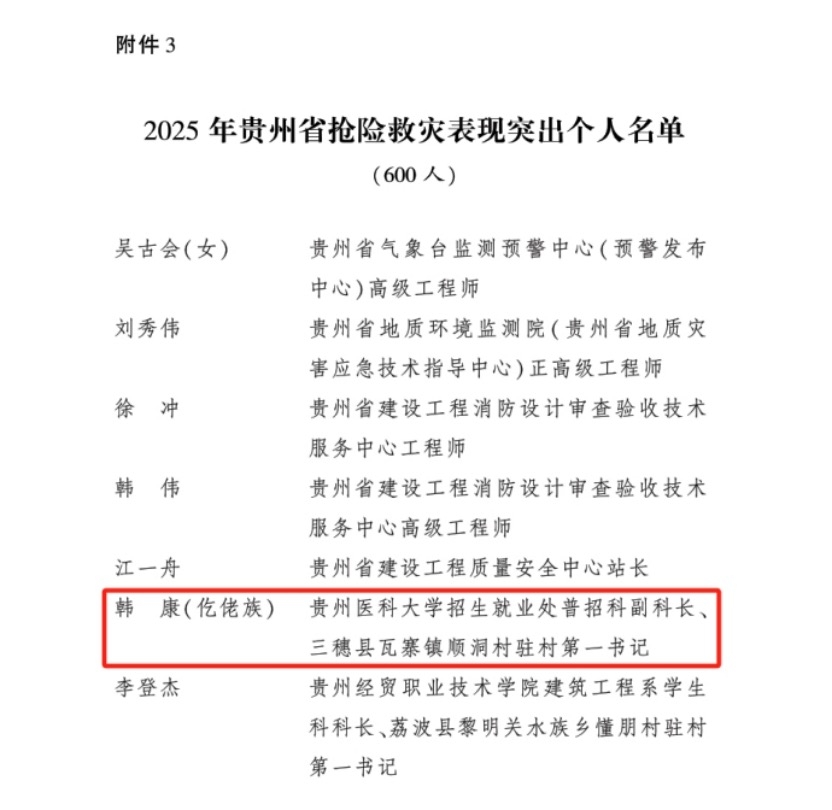 8月5日,中共贵州省委、贵州省人民政府发布了《关于对2025年全省抢险救灾表现突出集体和个人予以表扬的通报》,万象城官网驻村工作队三穗县瓦寨镇顺洞村驻村第一书记韩康荣获“2025年贵州省抢险救灾表现突出个人”荣誉称号。