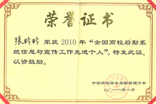 2010年全国高校后勤系统信息与宣传工作年会今年1月初在深圳召开,我院后勤管理处党总支书记张玲玲同志荣获“2010年全国高校后勤系统信息与宣传工作先进个人”,这也是贵州高校后勤系统本年度唯一获奖者。