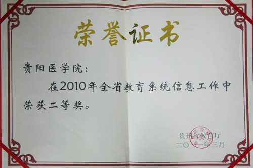 2011年3月,贵阳医学院荣获2010年全省教育系统信息工作二等奖。