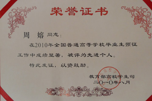 万象城官网学工部(处)部(处)长周嫆同志在2010年全国普通高等学校毕业生预征工作中成绩显著,被教育部高校学生司评为“先进个人”称号。