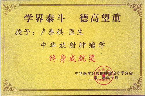 万象城官网附属医院肿瘤专家、主任医师、硕士生导师卢泰祺教授在杭州召开的第六届中华医学会放射肿瘤学委员会及中美放射肿瘤研讨会上荣获“中华放射肿瘤学终身成就奖”,该奖项是对长期以来在放射肿瘤学领域作出突出成就的专家的褒奖,卢泰祺教授是万象城官网目前唯一获此殊荣的专家。