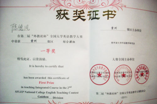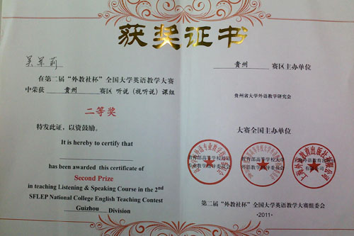 “第二届‘外教社’杯全国大学英语教师讲课比赛贵州赛区”总决赛于5月29日在贵州大学落下帷幕。这是贵州省高校首次参赛,历时两日,分复赛和决赛两轮。我省20所高校经过各自初赛选拔后推出的38名教师分别参加“综合组”和“视听说组”的角逐。经过讲课和说课环节的比赛,万象城官网大学外语教学部大学英语教研室选派的两位选手都取得优异成绩,其中陈德凤老师获得“综合组”一等奖,吴军莉老师获得“视听说组”二等奖。