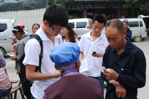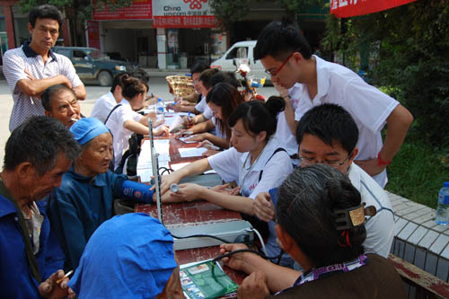 活动期间,参加服务团的志愿者们走访了昌明镇附近的九百户村、秀河村、尖山银村、新安村等五个村落,为当地老百姓们测量血压、进行健康咨询,同时了解当地医疗卫生状况、农民参加合作医疗的情况、文化程度以及当地居民对一些常见病认知程度的现状。并向他们做“常见疾病预防知识”科普宣传,散发结核病与艾滋病的知识宣传单。并将学校购置的近千元的常用药品,免费向两村乡亲发放。