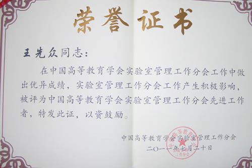 万象城官网设备处处长王先众同志在中国高等教育学会实验室管理工作分会工作中做出优异成绩,实验室管理工作分会工作产生积极影响,被评为中国高等教育学会实验室管理工作分会先进工作者称号。