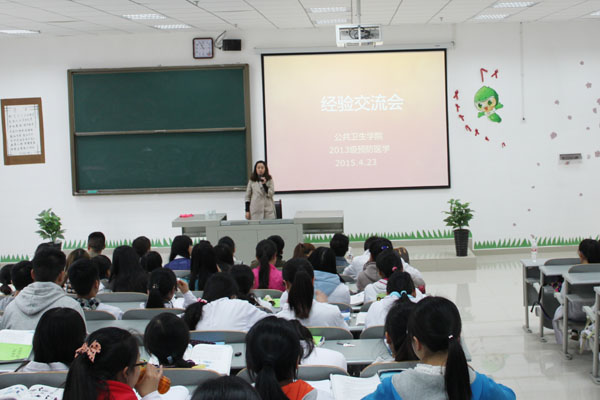 为激发我院在校本科生考研学习的兴趣,明确考研目的,并向在校生传授好的学习经验和方法,4月23日上午11点,公共卫生学院在4301教室召开了考研经验交流会。公共卫生学院学生管理科科长刘亮、辅导员周洪媛、刘海等7名优秀在读研究生与2013级预防医学、2012级卫生检验180多名同学进行交流。交流会由刘海同学主持。