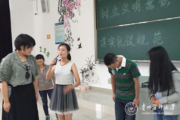 此次主题班会由罗华倩同学主持,2014级麻醉班全体学生共同参加。班会以PPT为主线,从着装、行为举止、交谈艺术等不同方面深入讲解礼仪知识,着重讲授了当代大学生在求职时的文明礼仪,同时注重同学们在校园生活中的校园礼仪。如:在校园内,自觉保持校园整洁,不乱扔果皮纸屑、不随地吐痰、不乱丢垃圾,严格遵守交通法规,自行车要存放在指定的地点,严禁在校内骑车带人等。现场邀请同学们参与礼仪小游戏,加深巩固礼仪知识。
