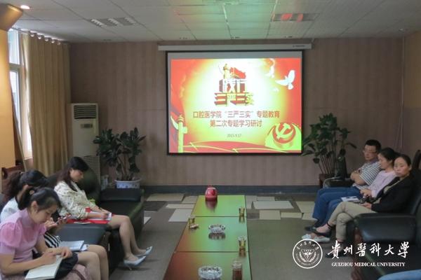 根据校党委关于“三严三实”专题教育的总体安排,9月17日,口腔医学院在北校区老药学楼四楼会议室召开“三严三实”专题教育第二次专题学习研讨。会议由口腔医学院党委副书记唐正龙主持,院党委班子成员参加,各行政科室、教研室以及临床科室负责人列席。