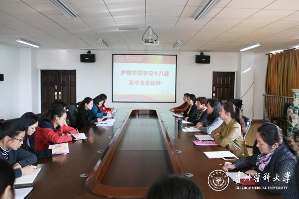 11月4日下午,护理学院在百川楼5楼会议室召开学习贯彻党的十八届五中全会精神专题会议。会议由护理学院党委书记贾秀英主持,党政领导班子和全体教职工参会。