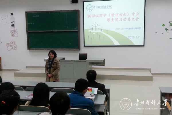 1月7日中午,医药卫生管理学院在4603教室召开了2012级药学(营销)专业实习动员大会,学院党委书记陈颖、院长汤磊、教研科副科长李端和部分专业教师出席了动员大会。