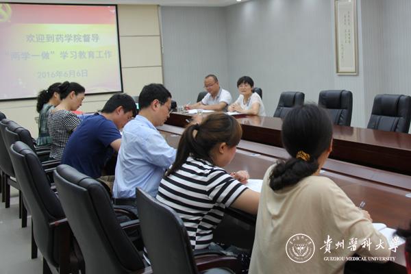 6月6日上午,校“两学一做”学习教育第一督导组到药学院督导检查。药学院党委书记席晓岚、副书记徐贵荣、党委委员和各支部书记参加了此次督导检查。
