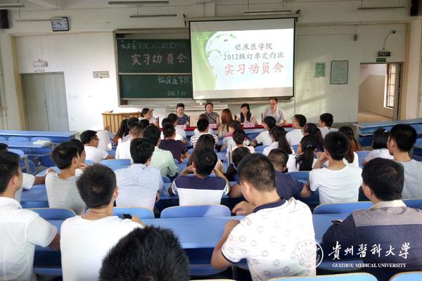 7月10日下午18:30,临床医学院在北校区1401教室召开2012级订单定向班毕业实习动员大会,会议由临床医学院生产实习科科长许娜主持,出席会议的有临床学院党委书记周红、生产实习科副科长苗菁和2012级年级辅导员。