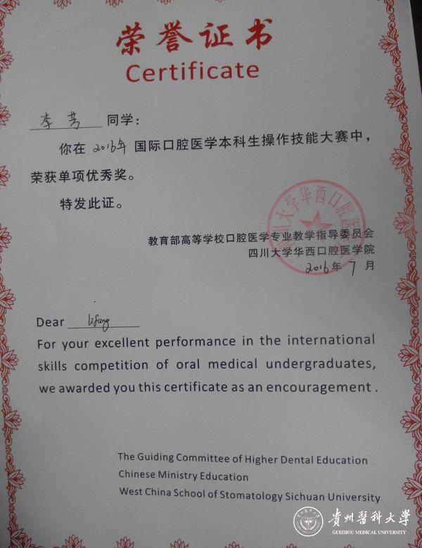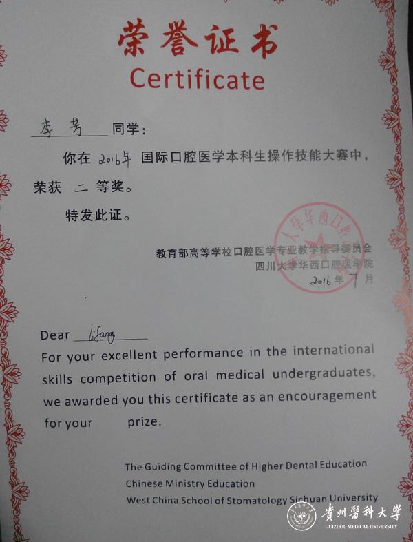7月14日上午,李芳作为awc777万象城娱乐官网代表参加华西夏令营中的国际口腔医学本科生操作技能大赛中的7个项目,最终在国内外高校中荣获二等奖,另外也在巴唐绷带包扎项目中荣获单项奖。