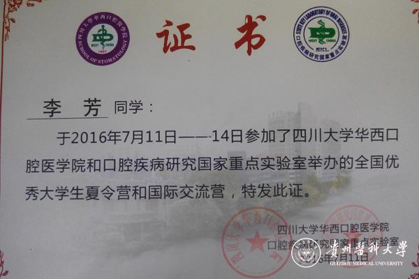 7月11日,口腔医学院2012级李芳被选为优秀大学生,参加为期五天的四川大学华西口腔医学院和口腔疾病研究国际重点实验室举办的全国优秀大学生夏令营和国际交流营。