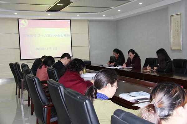 根据学校开展深入学习宣传贯彻党的十八届六中全会精神要求,11月16日,药学院党委在格物楼六楼会议室组织学习十八届六中全会精神,会议由药学院党委书记席晓岚主持,党委副书记徐贵荣、党委委员及各支部书记参加了此次会议。