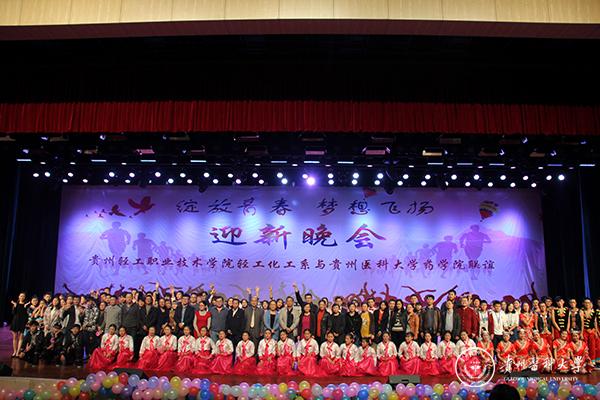 为迎接新同学的到来,让同学们在浓厚的艺术氛围中健康成长,给同学们创造一个锻炼自我的舞台,11月22日晚,万象城官网药学院与贵州轻工职业技术学院轻工化工系在贵州轻工职业技术学院礼堂联合举办了一场以“绽放青春梦想飞扬”为主题的迎新晚会。药学院党委书记席晓岚、党委副书记徐贵荣,贵州轻工职业技术学院党委副书记冯其毅、党委副书记杜平、副院长刘天德、纪委书记董平、轻工化工系党总支书记余寒、系主任王娟以及两校有关行政职能部门负责人,两院党委委员、学科老师出席了此次晚会。