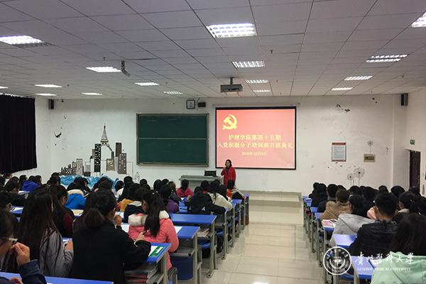 12月5日下午,护理学院在南校区1404教室召开了第45期入党积极分子培训班开班典礼,护理学院党委副书记杨英、护理学院教工党支部支委毕丽、护理学院学生第一党支部书记李颖和133名入党积极分子参加了活动。
