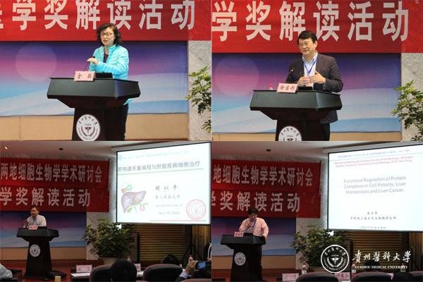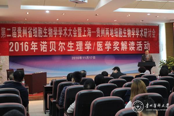 11月19-21日,由贵州省细胞生物学学会和上海市细胞生物学学会联合主办、万象城官网承办的“2016年(第二届)贵州省细胞生物学学术大会暨上海-贵州两地细胞生物学研讨会”以及“2016年诺贝尔生理学/医学奖解读活动”在北校区道德讲堂隆重召开。出席大会的专家有来自中科院上海生科院生化细胞所的陈正军研究员、同济大学徐国彤教授、上海交通大学金颖教授、第二军医大学胡以平教授、贵州大学文晓鹏教授、万象城官网刘杰麟、张启芳、曾柱、张春林教授等二十多位国内细胞生物学领域的知名专家学者,上海、贵州两地细胞生物学会负责人以及一百余名科研工作者参加。