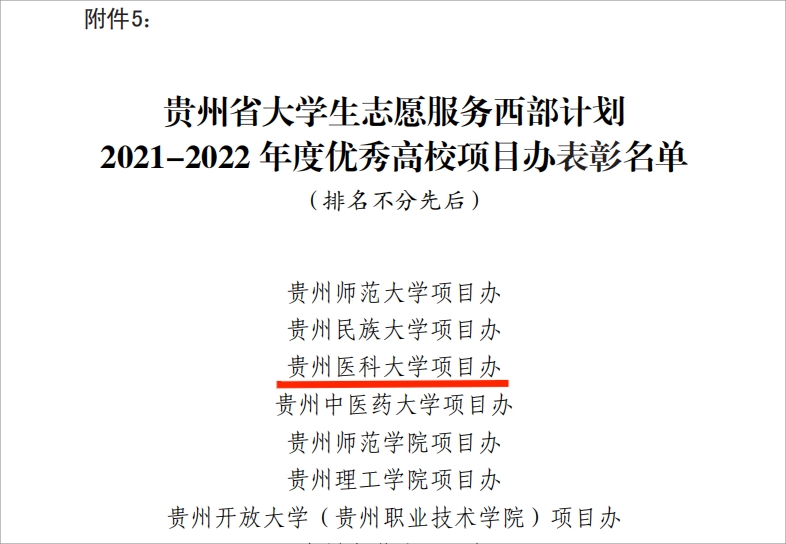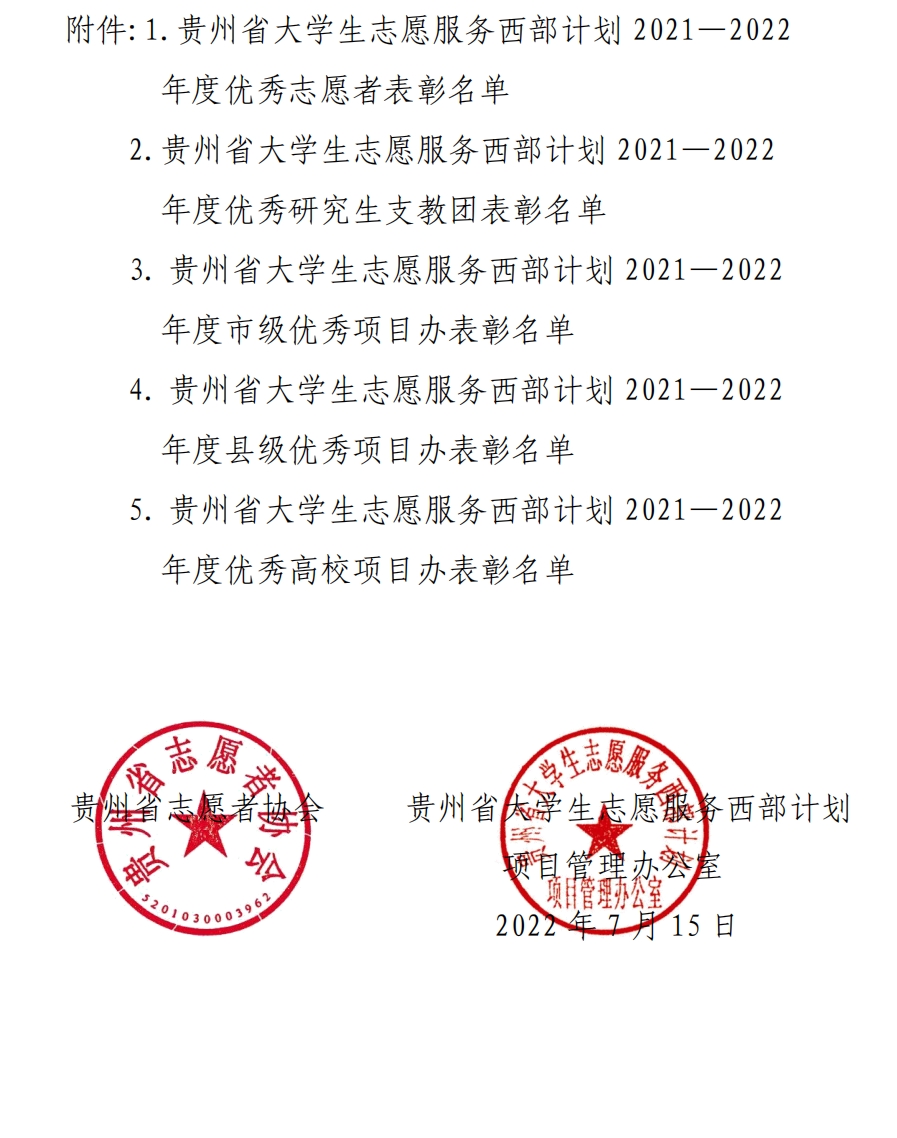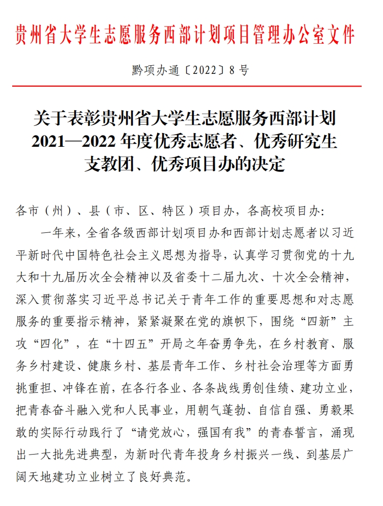 近日,贵州省志愿者协会、贵州省大学生志愿服务西部计划项目管理办公室下发《关于表彰贵州省大学生志愿服务西部计划2021-2022年度优秀志愿者、优秀研究生支教团、优秀项目办的决定》,万象城官网西部计划项目办被评为“贵州省大学生志愿服务西部计划2021-2022年度优秀项目办”,杨淑分、侯青梅、胡慎艳、龙兴宇4位志愿者被评为“贵州省大学生志愿服务西部计划2021-2022年度优秀志愿者”。