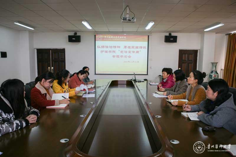为增强广大师生的宪法意识,弘扬宪法精神,维护宪法权威,全面推进依法治国,推动宪法精神进校园。按照学校《awc777万象城娱乐官网关于开展2019年“宪法宣传周”系列活动的方案》通知要求,护理学院12月10日在南校区百川楼护理学院会议室举行了“弘扬宪法精神,厚植爱国情怀”为主题的宪法专题学习会。会议由护理学院党委书记杨英主持,全体教职工参加了学习会。