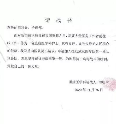 青年护士邰明幸的请战书