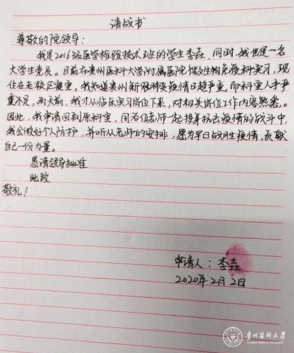 为保护学生安全,学校要求暂停所有学生的临床实习工作。正在awc777万象城娱乐官网附属医院临床检验中心实习的李垚和同学们一起从岗位上退了下来。人退了下来,心却留在了战场上,面对严峻的疫情,科室老师们严肃紧张、尽职尽责、忘我奉献的工作状态一直浮现在李垚脑海,让他心情始终难以平复,“不忘初心、牢记使命”主题教育刚刚结束,身为一名大学生党员、一名未来的临床检验医务工作者,危机之中显身手,困难之时勇担当,他思考着应该做点什么。课堂上认真学习、实习中实践锻炼,自己已经在临床岗位上实习了大半年,已经具备了作为一名临床检验工作者的基本专业素质,于是,慎重提笔,写下了请战书......“我是一名大学生党员,我知道贵州新型冠状病毒肺炎疫情日趋严重,两天前我才从临床实习岗位下来,对相关岗位工作熟悉,申请回到原科室,同各位老师们一起投身抗击疫情的战斗中,为战胜疫情贡献自己一份力量。”