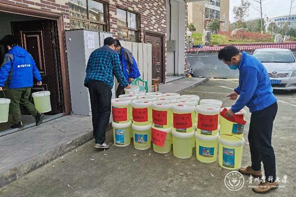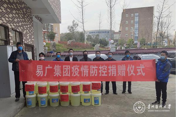 自新型冠状病毒肺炎疫情发生以来,疫情防控物资紧缺,口罩、84消毒液等物品很难购买。2月15日,贵州易广建设集团调动各方资源购买了1吨84消毒液捐赠给万象城官网,贵州易广建设集团副总经理曹文毅、后勤管理处(后勤集团)副处长吴陵江、贵安新区大学城管委会办公室副主任郑维俊、贵安新区大学城管委会建发部负责人徐军、维修服务中心工作人员参加了捐赠仪式。