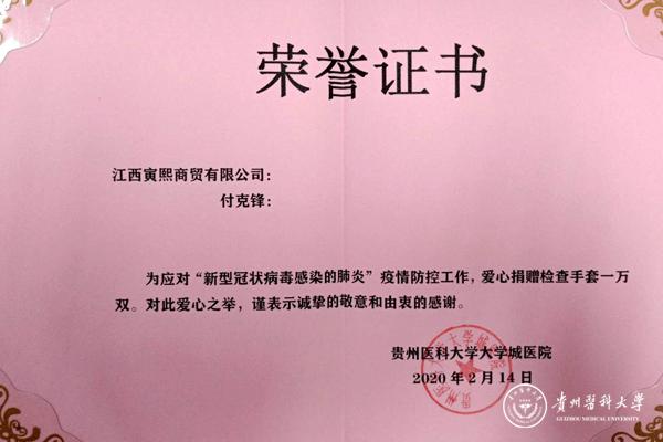 2月14日,江西寅熙商贸有限公司负责人付克锋捐赠检查手套一万双,价值26000。医院接洽人员向付克锋表示感谢时,付克锋说:“货到了就好,希望能帮助到你们。”医生给疑似病人查房时为了避免交叉感染,查一个病人换一双手套;给筛查人员采样时,采一个病人换一双手套。检查手套的消耗量比较大,医院正计划买检查手套,江西寅熙商贸有限公司的捐赠解决了医院的燃眉之急。