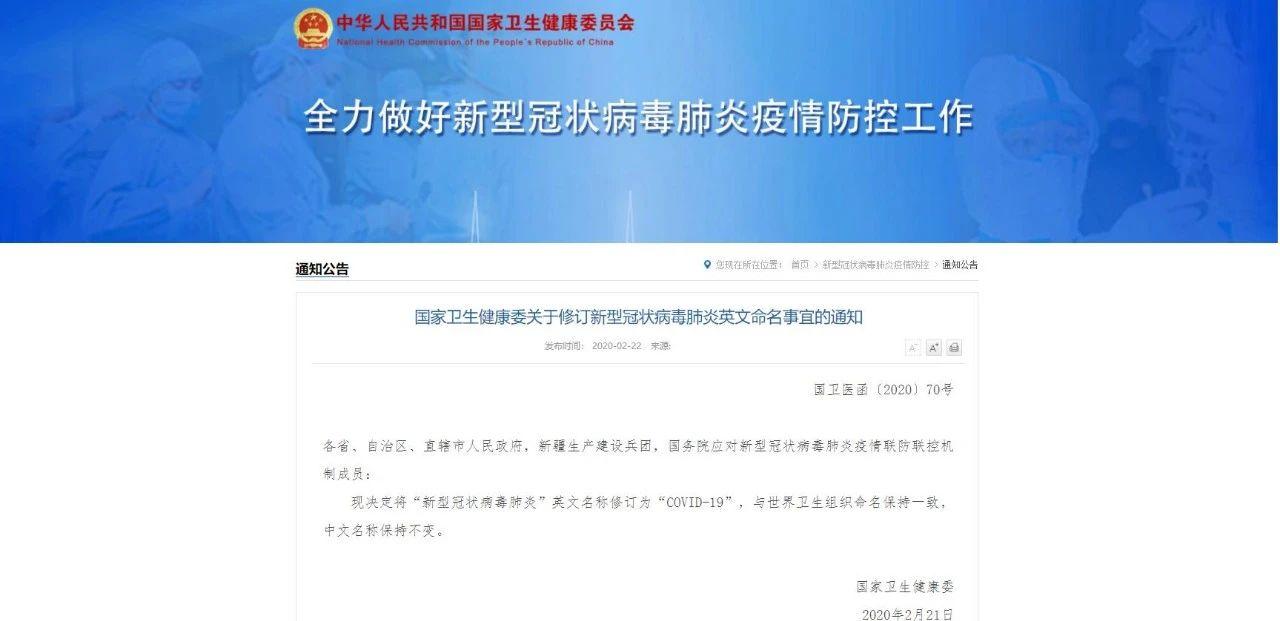 国家卫健委下发通知:现决定将“新型冠状病毒肺炎”英文名称修订为“COVID-19”,与世界卫生组织命名保持一致,中文名称保持不变。