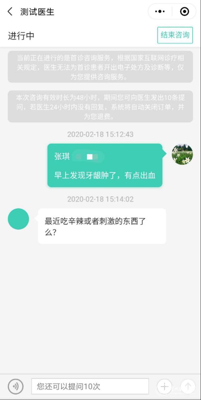 提交问诊后填写的咨询问题和添加的图片将会发给医生,患者自动进入咨询页面,可等待医生回复,咨询完毕后点击【结束咨询】并对医生做评价