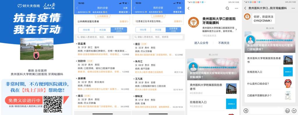 新冠肺炎疫情爆发以来,由于口腔诊疗的特殊性,根据省卫健委的相关要求,贵州省口腔专科门诊及诊所相继发布了停诊或延迟开诊的通知。不能去医院看牙,很多人忧心忡忡,作为非一线科室医生,在做好口院抗疫各项工作和本职工作的同时,预防及儿童口腔科的医生们采取电话、短信,微信及视频或语音通话等多种形式为患者进行免费咨询,为疫情期不方便前来就诊的口腔患者答疑解惑,守护好人民群众的口腔健康。