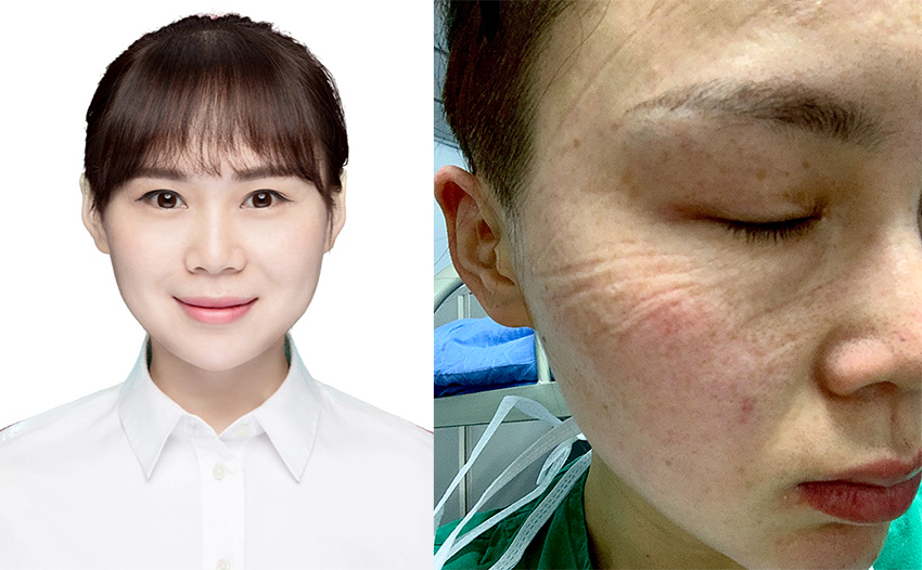 黑龙江佳木斯大学附属第一医院主管护师程文杰,支援湖北省孝感市安陆市普爱医院。支援一个月后,额头和鼻子两侧都出现了深深的勒痕。她说,“我们每天在与时间赛跑,与病毒拼搏。看着患者们得到救治,逐渐康复出院,我们内心无比高兴与不舍。高兴是因为他们终于康复能与家人团聚了,不舍是他们的纯朴热情时刻打动着我们,我们不舍与他们离别。”