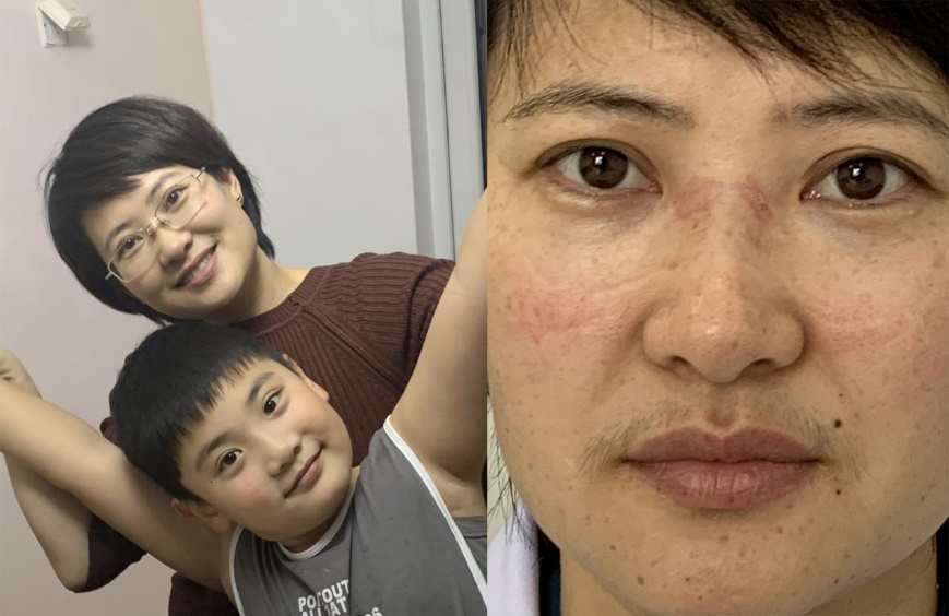 黑龙江省医院六顺社区医院护士长胡艳敏出发前两日,是儿子申朗的7岁生日,母子俩照了张合影。两天后,胡艳敏收到了支援湖北孝感的通知,立刻动身出发。支援孝感市汉川市人民医院重症病房近一个月,胡艳敏从隔离区出来后拍摄了一张照片,额头和鼻翼两侧都有深深的勒痕,鼻梁上的皮肤出现了一些破损。