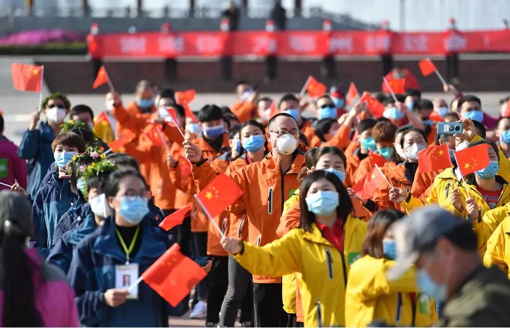 酒店人员与首批即将撤离鄂州的贵州医疗队队员挥舞着国旗,一起高唱《我和我的祖国》