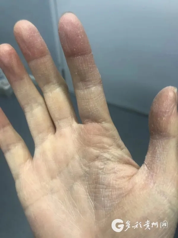 邹杨每天很忙,除了要帮助患者领取生活用品,还要给患者发放一日三餐,分发药物、测体温、测指脉氧等。由于长时间戴3层手套,邹杨原本细嫩的手部皮肤皱巴巴的。