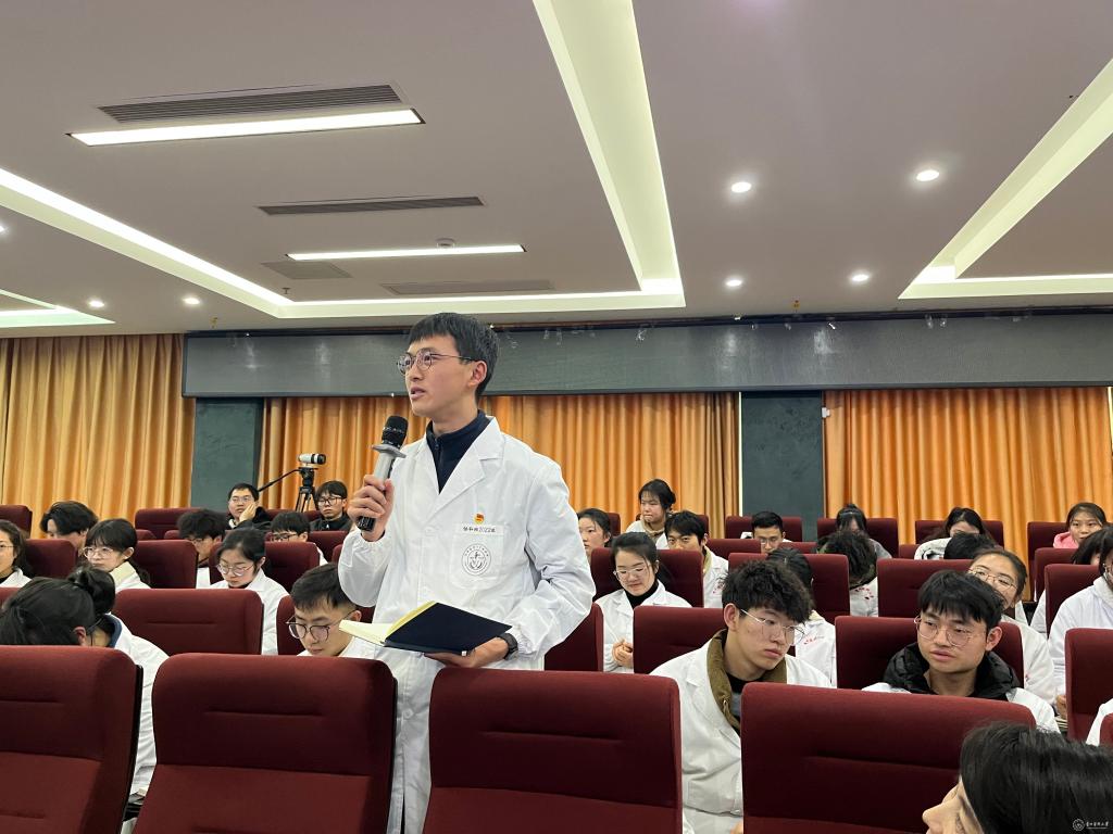 蒋红梅为同学们阐释了“早临床”的内涵和重要性,鼓励同学们尽早树立临床理念,并学会主动参与临床实践,同时对附属医院所有用心致力于教学的领导和老师们表示感谢。她指出,附属医院在医学人才培养、医学教育上的功能和责任除毕业后教育外,临床医学类专业学生院校阶段的教育教学职责也十分重要。