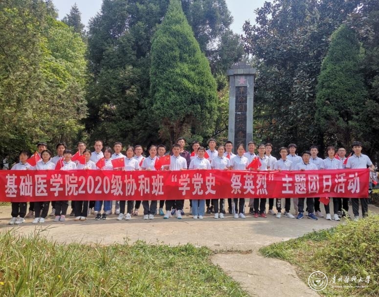清明节即将来临,为深入贯彻落实党史学习精神,在革命传统教育基地现场开展党史学习教育,使学生缅怀革命先烈,感党情、颂党恩,珍惜当下的幸福美好生活。4月1日,基础医学院“协和班”全体师生来到贵安新区马场镇烈士陵园开展“学党史,祭英烈”主题团日活动。基础医学院分团委书记、学生第二党支部书记以及“协和班”辅导员及全体同学参加活动。