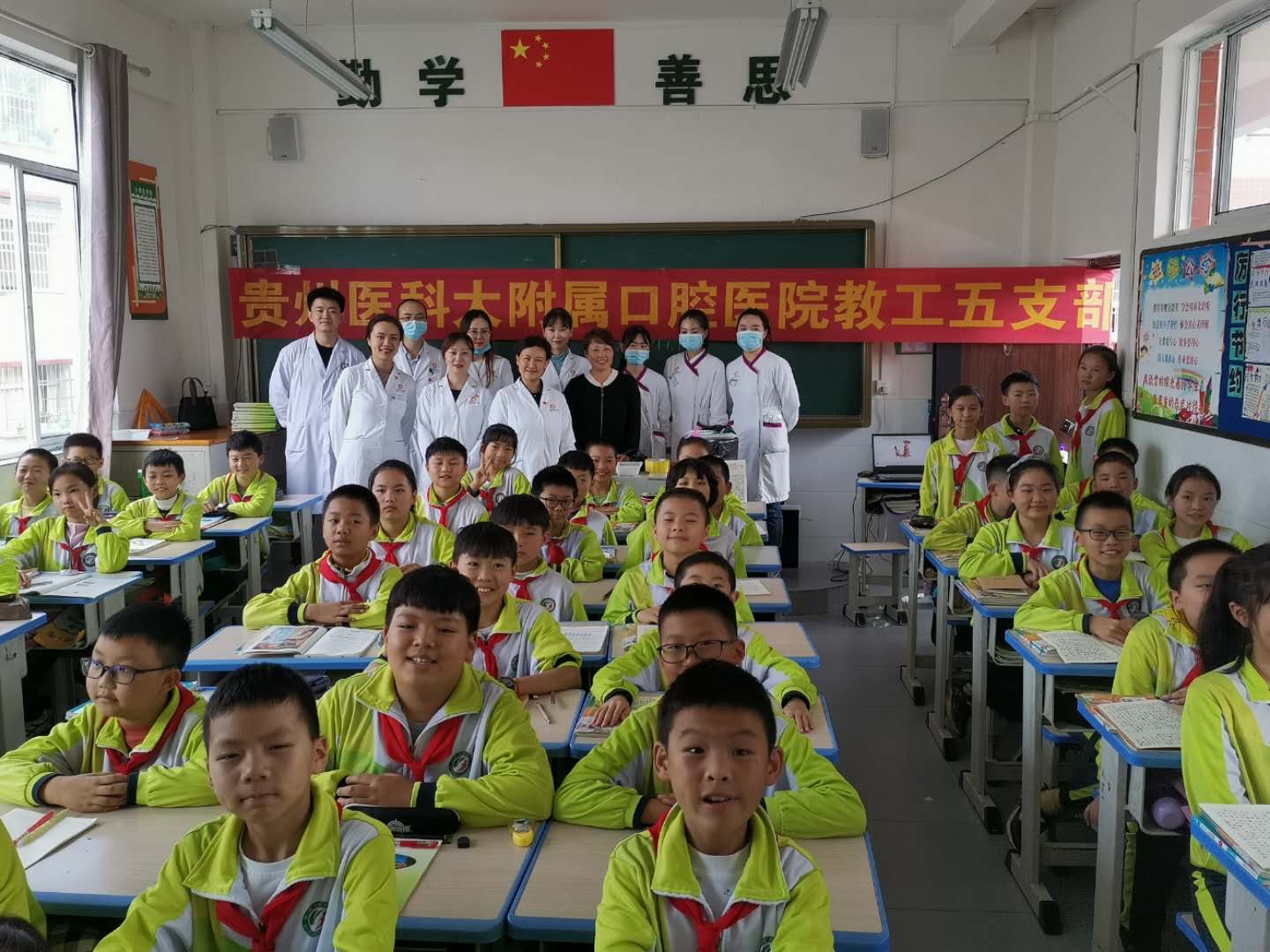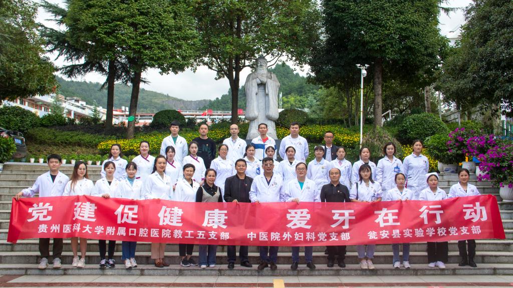 近期,awc777万象城娱乐官网附属口腔医院教工第五党支部、瓮安县中医院外妇科党支部走进瓮安县实验学校联合开展了“党建促健康 爱牙在行动”主题活动。awc777万象城娱乐官网附属口腔医院教工第五党支部书记贾莹和第八党支部书记吴珊带领支部党员,携手瓮安县中医院副院长丁光红等党员同志及医护志愿者一行28名工作人员组成了一支“口腔义诊小分队”,到瓮安县实验小学开展口腔健康检查、知识讲座等志愿服务。