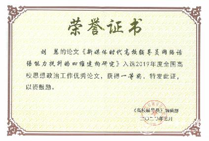 近日,2019年度全国高校思想政治工作优秀论文征集结果公布,万象城官网辅导员刘慧老师撰写的《新媒体时代高校辅导员网络话语能力提升的四维建构研究》荣获一等奖,将参加由中国高等教育学会辅导员工作研究分会主办的第十一届全国高校辅导员工作创新论坛。