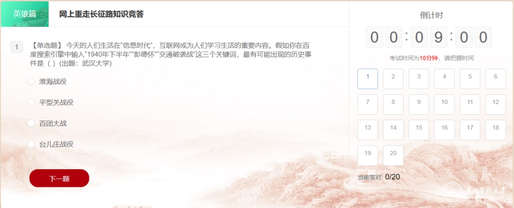 为深入学习贯彻习近平总书记关于学校党建和思政工作的重要指示批示精神,贯彻落实教育部、教育厅印发有关开展“网上重走长征路”暨推动“四史”学习教育的文件精神,现面向全校师生组织开展“网上重走长征路”暨推动“四史”学习教育竞答活动。
