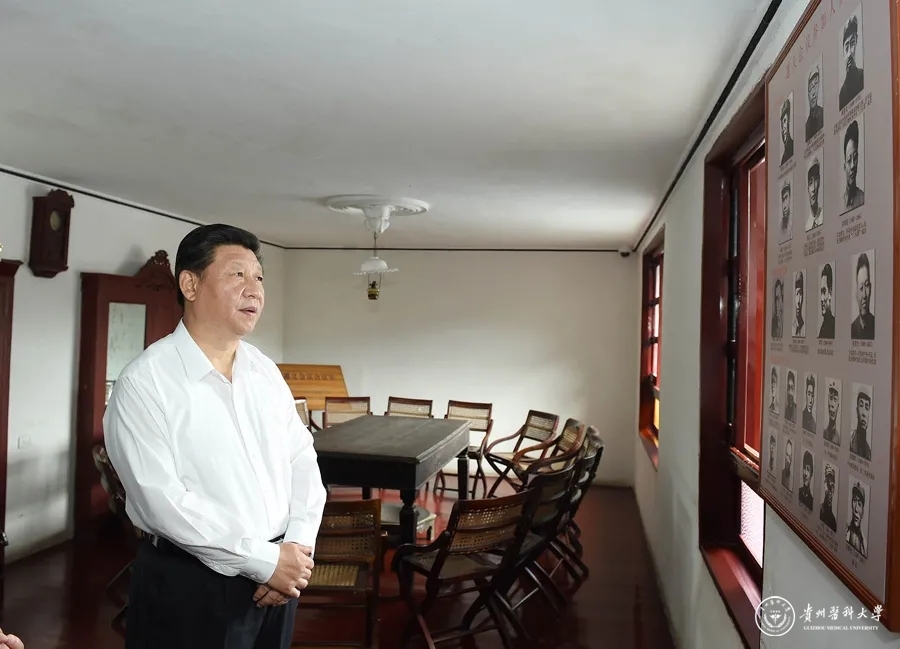 2015年6月,在遵义会议80周年之际,总书记前往贵州考察,首站就来到遵义。 这是党的十八大后习近平总书记第一次来贵州考察。 2015年6月16日下午,总书记来到遵义会议会址参观。他走进周恩来、朱德等老一辈革命家住过的房间和遵义会议会议室,在遵义会议参会人员照片前久久凝视,听取讲解。