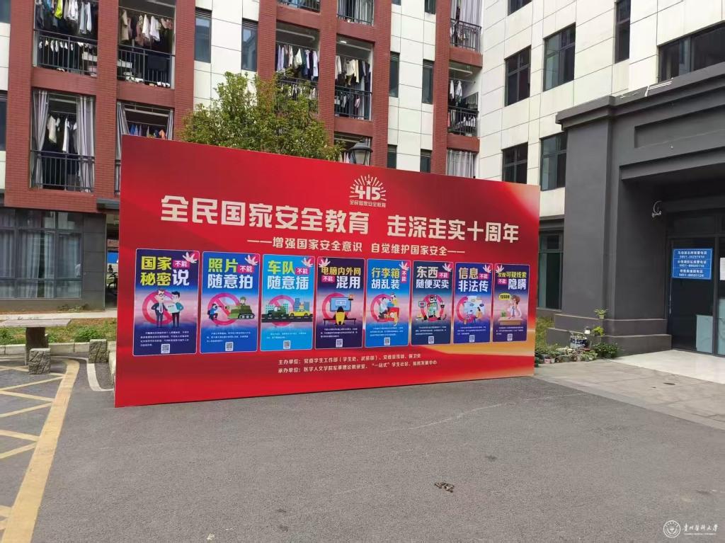 阵地宣传固本:构建校园安全育人生态。校党委宣传部(精神文明办公室)、党委学生工作部(学生处、武装部)、校团委、保卫处等部门,以“线上+线下”立体化宣传矩阵推动国家安全教育入脑入心。线下,在“一站式”学生社区设置国家安全教育主题展区,陈列十年来我国国家安全领域历史性成就图文展板,发放《贵州教育报-全民国家安全教育特刊》1000余份、国家安全宣传小册子1500余本,吸引近5000名师生驻足学习;学生社区LED屏滚动播放《国安重磅案例之迷失的娇子》《国安重磅案例之“糊涂的研究员”》等原创国安教育短片,生动诠释国家安全一切为了人民、一切依靠人民的内在关联。线上,“贵医学子”微信公众号推出“国家安全十周年”专栏,发布“医学生必知的10大安全防线”等系列推文,易班平台开展“国家安全知识竞答”,24小时内参与师生突破1.2万人次,形成“人人学安全、人人讲安全”的浓厚氛围。