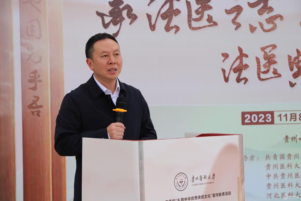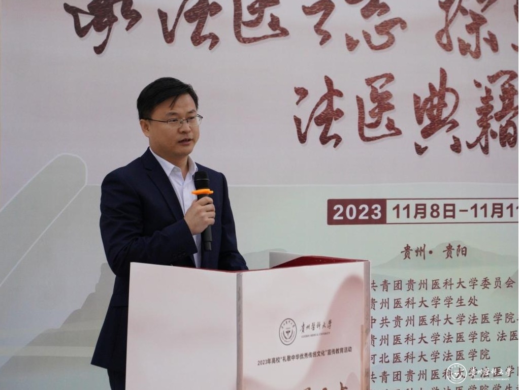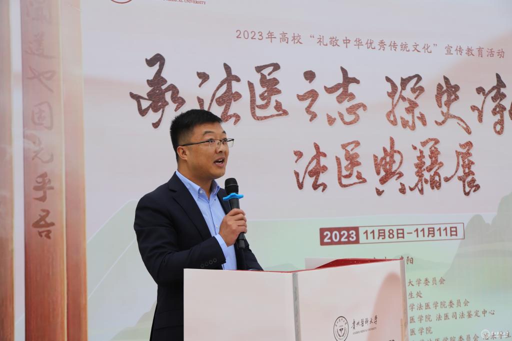 宋随民致辞,他希望通过典籍展示我国古代悠久灿烂又一脉相承的古代法医历史,增加青年学子对法医历史的了解和认知,不断增强历史自觉和文化自信,达到以史铭志、以史思源、以史聚力、以史促学的目的。